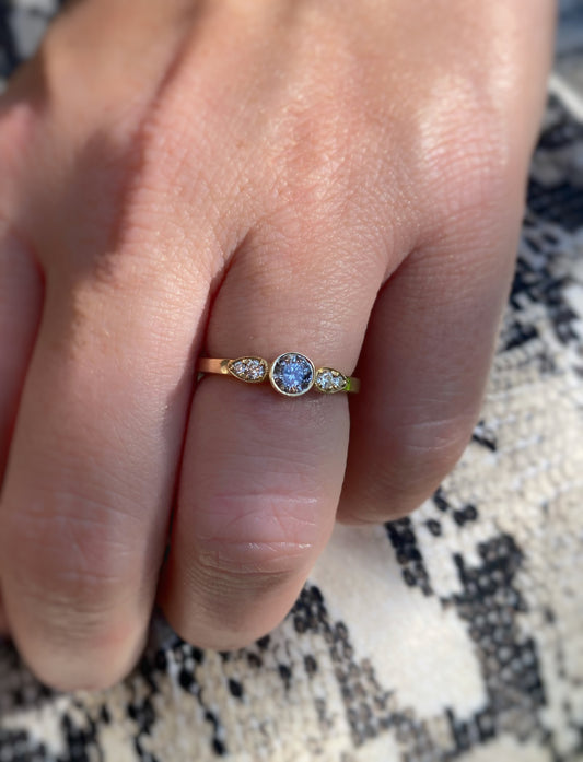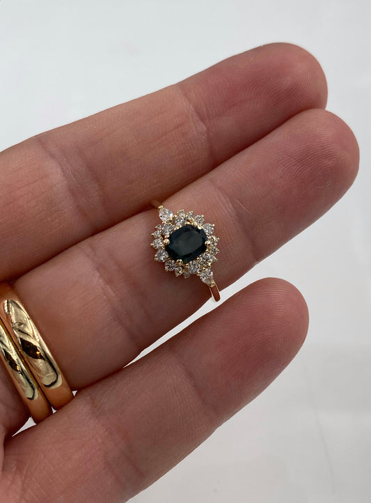 14k Gold Teal Blue Sapphire Ring with Diamond Halo