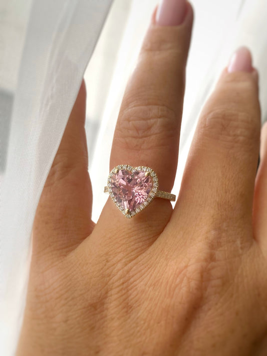 14K Gold Heart-Shaped Pink Morganite Ring with Natural Diamond Halo