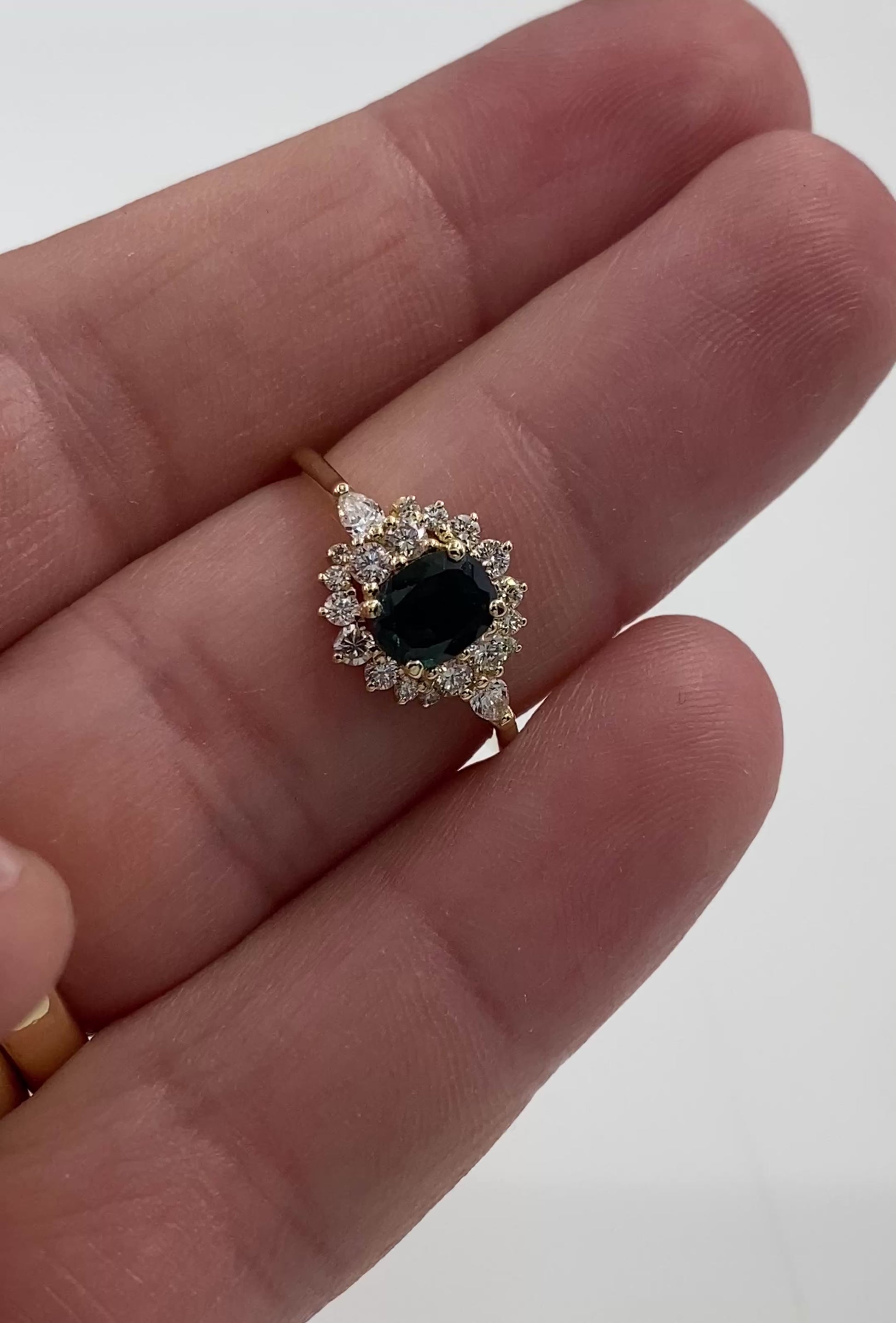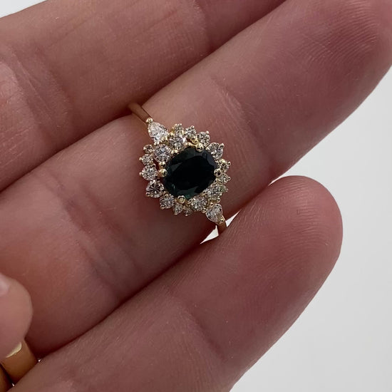This exquisite 14k solid gold ring features a deep Teal blue sapphire center stone, gracefully surrounded by a brilliant diamond halo. The vintage-inspired design brings together classic sophistication and modern craftsmanship, making it the perfect piece for engagements, anniversaries, or simply celebrating yourself.