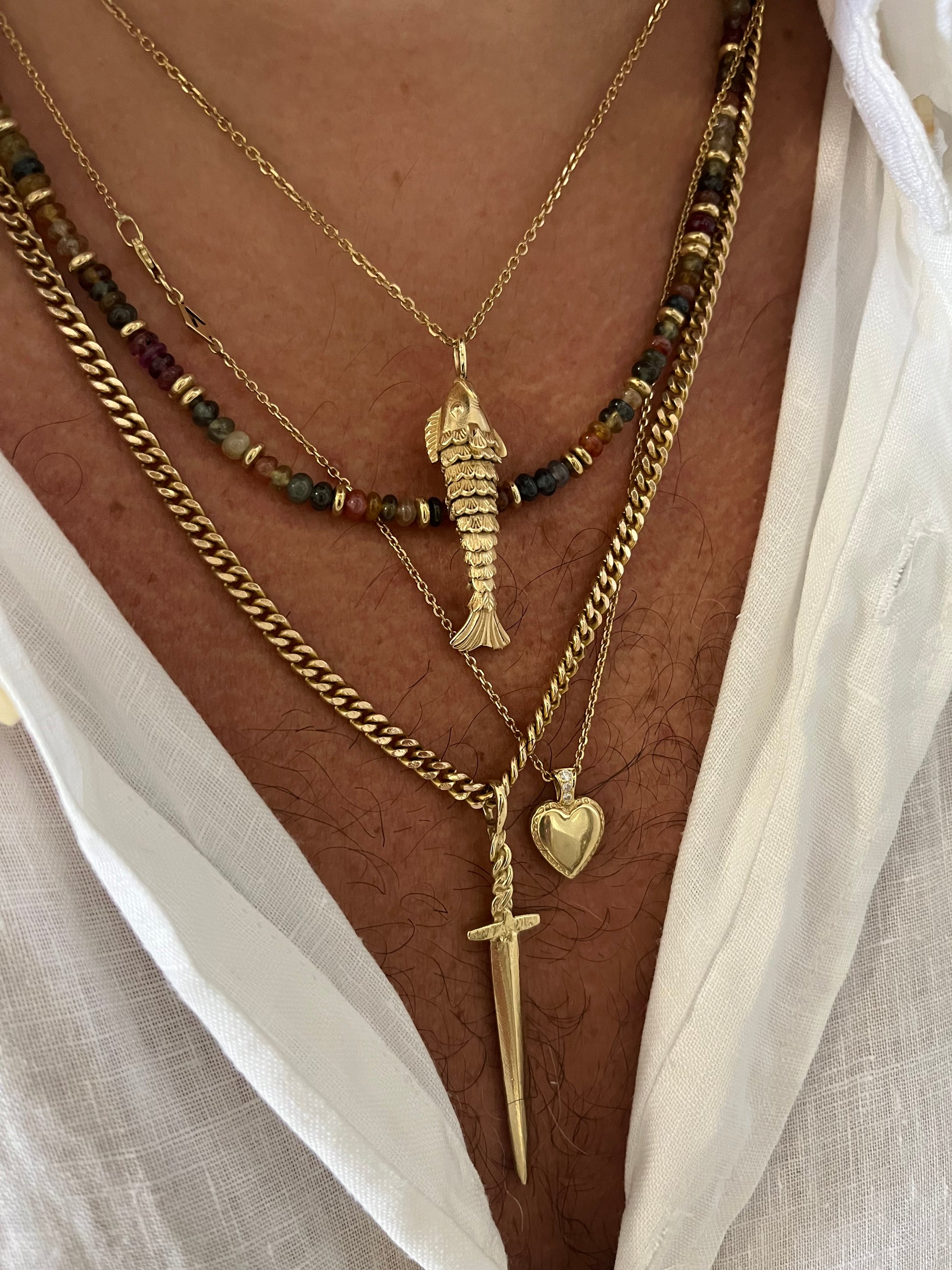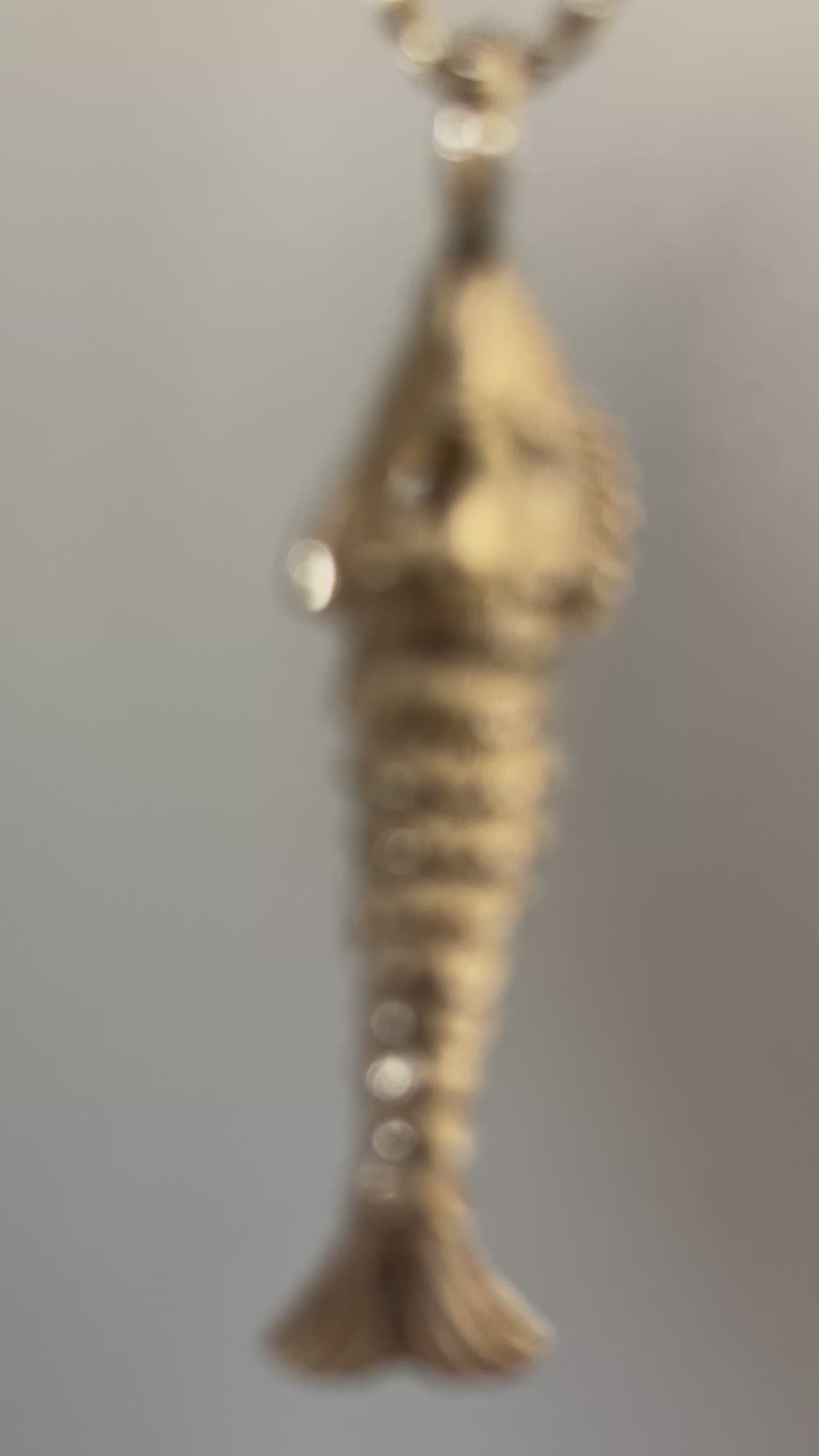 This handmade 14k solid gold fish necklace is crafted from 11 individual articulated segments, each connected by tiny hinges that allow the pendant to move and sway like a real fish in water.