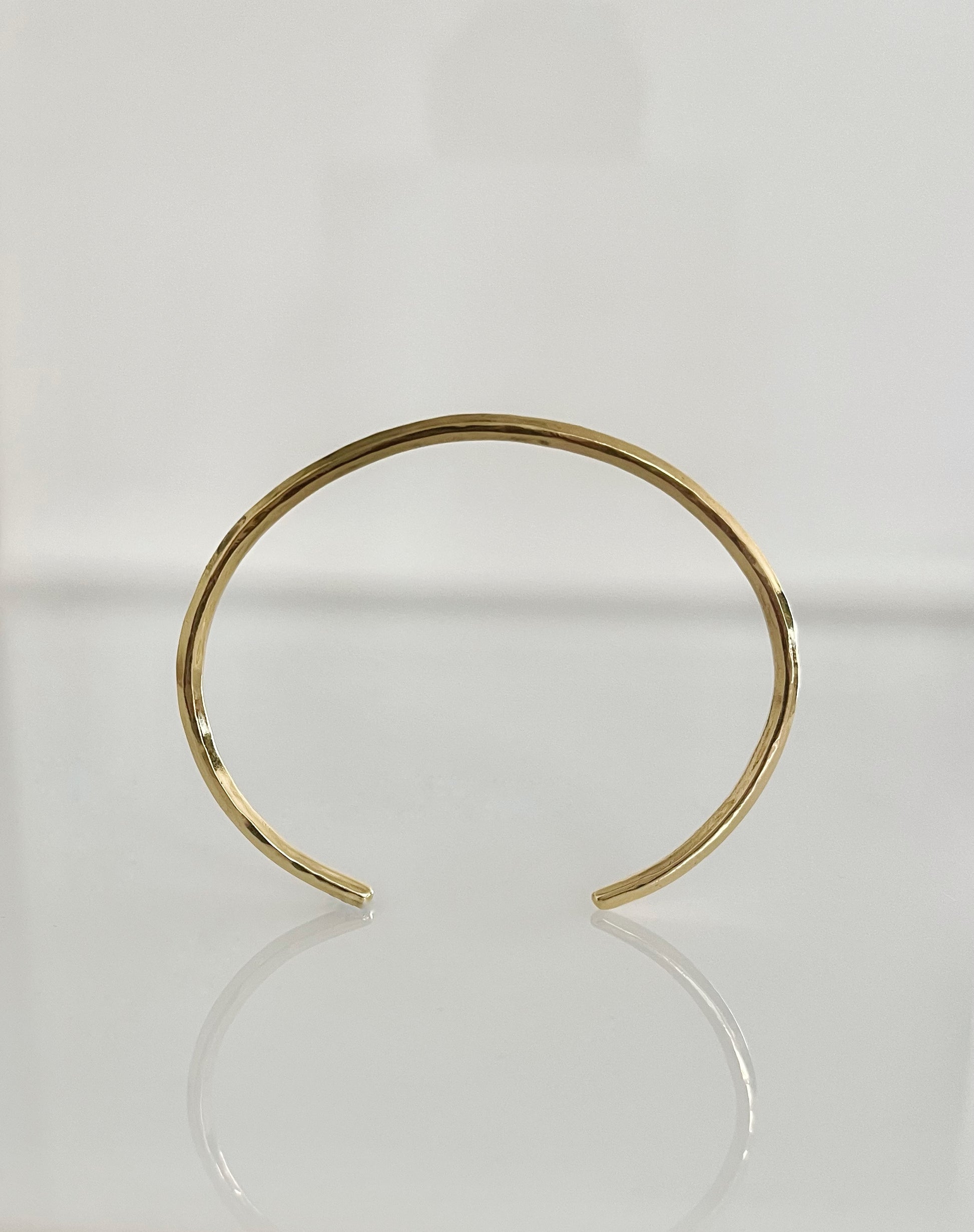 Hand-forged from recycled 14k solid gold, this open cuff bracelet features a raw, hammered finish that reflects the light with every movement. Each piece is uniquely crafted—no two are exactly alike, making yours truly one of a kind.